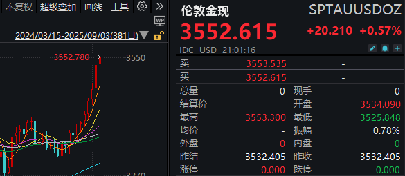 北京时间9月3日晚间,现货黄金首次站上3550美元/盎司,日内涨0.57%.