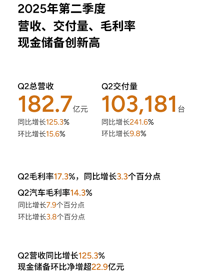 小鹏汽车今年第二季度营收182.7亿元,较2024年同期增长125.3%,再次刷新了单季度营收纪录;第二季度总交付量10.32万辆,同比增长241.6%,同样刷新自家纪录。尽管营收只有理想汽车的约六成,但交付量数据与理想差距已经缩小到了0.79万辆,而且第二季度小鹏汽车毛利率达17.3%,连续八个季度增长,距离理想汽车的20.1%,差距缩小到三个百分点以内。