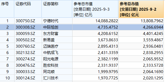 【大河财立方消息】9月3日,中际旭创股价大涨超10%,总市值攀升至4735.48亿元,首次超越东方财富,跃居创业板总市值第二位。