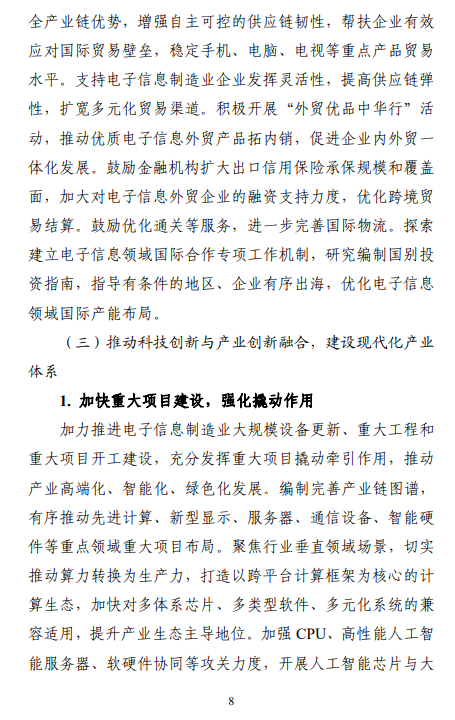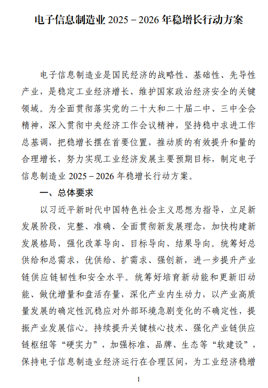 【大河财立方消息】9月4日,工业和信息化部、市场监督管理总局联合印发《电子信息制造业2025-2026年稳增长行动方案》。