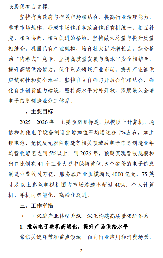 方案提出:到2026年,预期实现营收规模和出口比例在41个工业大类中保持首位,5个省份的电子信息制造业营收过万亿,服务器产业规模超过4000亿元,75英寸及以上彩色电视机国内市场渗透率超过40%,个人计算机、手机向智能化、高端化迈进。