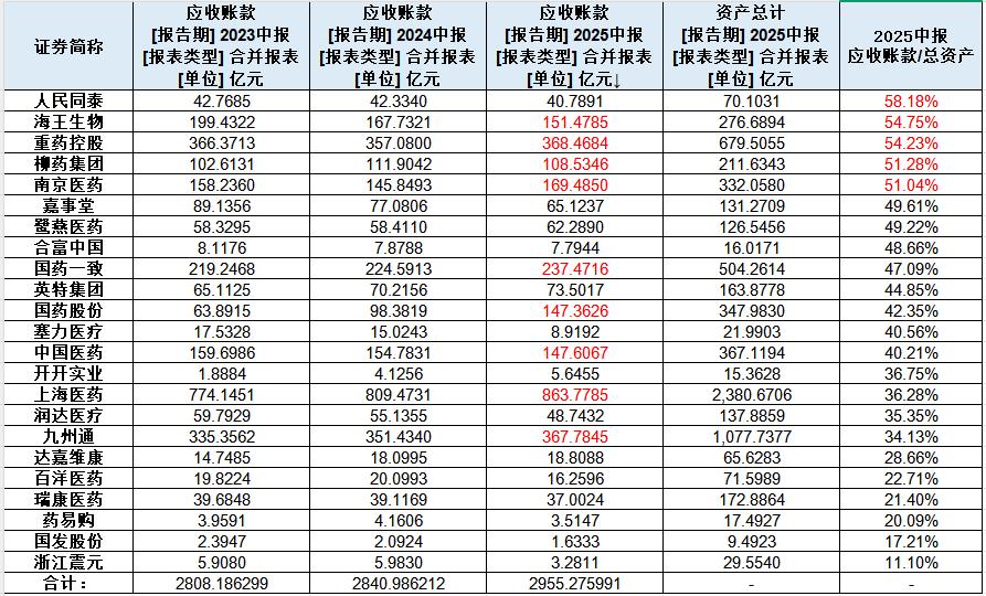 Wind数据显示,2025年上半年末,23家A股医药流通企业应收账款金额合计2955.28亿元,2023年、2024年同期分别为2808.19亿元、2840.99亿元。可以看出,近年来医药流通企业应收账款整体有增长趋势。
