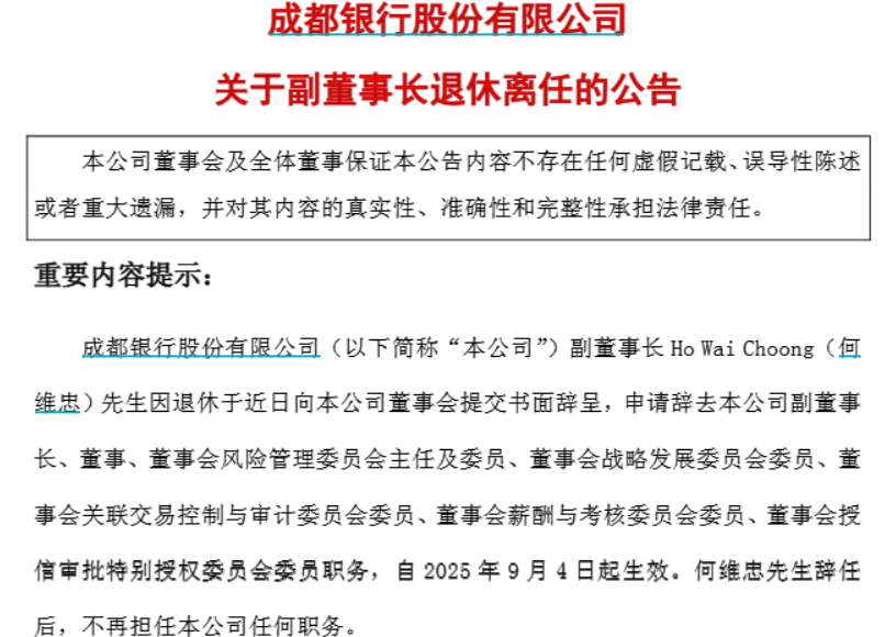 成都银行公告提到,何维忠因退休于近日向公司董事会提交书面辞呈,申请辞去公司副董事长、董事、董事会风险管理委员会主任及委员、董事会战略发展委员会委员、董事会关联交易控制与审计委员会委员、董事会薪酬与考核委员会委员、董事会授信审批特别授权委员会委员职务,自2025年9月4日起生效。何维忠原定任期到期日为2027年6月11日。