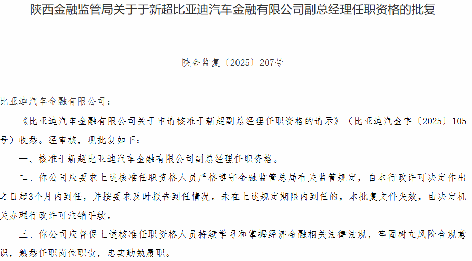 【大河财立方消息】9月5日消息,陕西金融监管局近日批复,核准于新超比亚迪汽车金融有限公司副总经理任职资格。