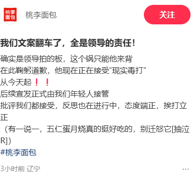 关于文案“翻车”,桃李面包表示“全是领导的责任”,并称“确实是领导拍的板,这个锅只能他来背,在此鞠躬道歉,他现在正在接受‘现实毒打’。从今天起,后续宣发正式由我们年轻人接管。批评我们都接受,反思也在进行中,态度端正,挨打立正。”