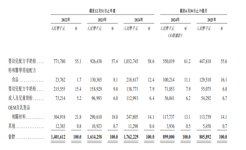 招股书显示,羊奶粉收入占宜品集团营收一半以上。2022年、2023年、2024年,宜品集团婴幼儿配方羊奶粉收入分别为7.72亿元、9.26亿元、10.33亿元,占总收入的55.1%、57.4%、58.6%,2025年上半年,羊奶粉收入4.49亿元,占总收入的55.6%。特殊医学用途配方食品业务增长迅猛,从2022年的0.24亿元激增至2024年的2.19亿元,占比从1.7%跃升至12.4%。