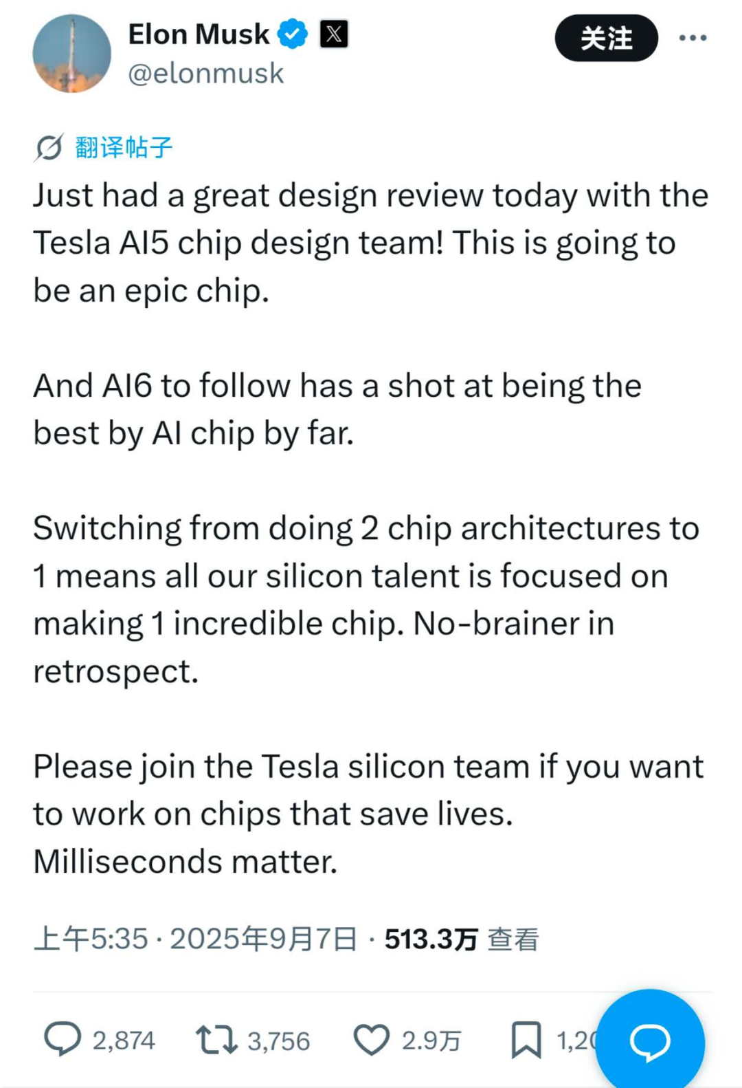 马斯克表示,从同时开发两种芯片架构转变为只开发一种,意味着我们所有的芯片人才都专注于打造一款令人惊叹的芯片。回想起来,这无疑是一个明智之举。“如果你想从事能拯救生命的芯片研发工作,请加入特斯拉硅团队。毫秒之差至关重要。”