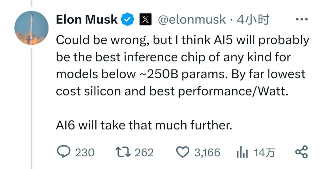 马斯克在评论区补充称,“我认为对于参数少于2500亿的模型来说,AI5很可能是所有类型推理芯片中最好的。”他说:“它的成本是迄今为止最低的,性能、功耗比也是最好的。”