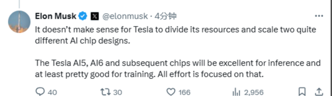 今年8月,马斯克在社交媒体上回复网友称,特斯拉分散资源并同时开发两种截然不同的AI芯片设计是没有意义的。特斯拉的AI5、AI6及后续芯片在推理方面将表现出色,至少在训练方面相当不错,所有努力都将集中在这上面。