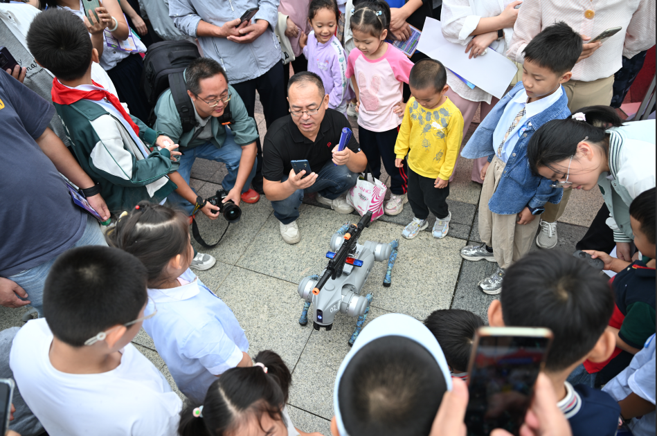 最受欢迎的“明星”莫过于东方红无人驾驶智能拖拉机、宇树机器狗和人工影响天气火箭车。孩子们兴奋地爬上拖拉机驾驶座,摆出各种造型;机器狗伸出“前爪”与人握手,萌态十足;火箭车旁,听完讲解的小朋友争先恐后排队合影。