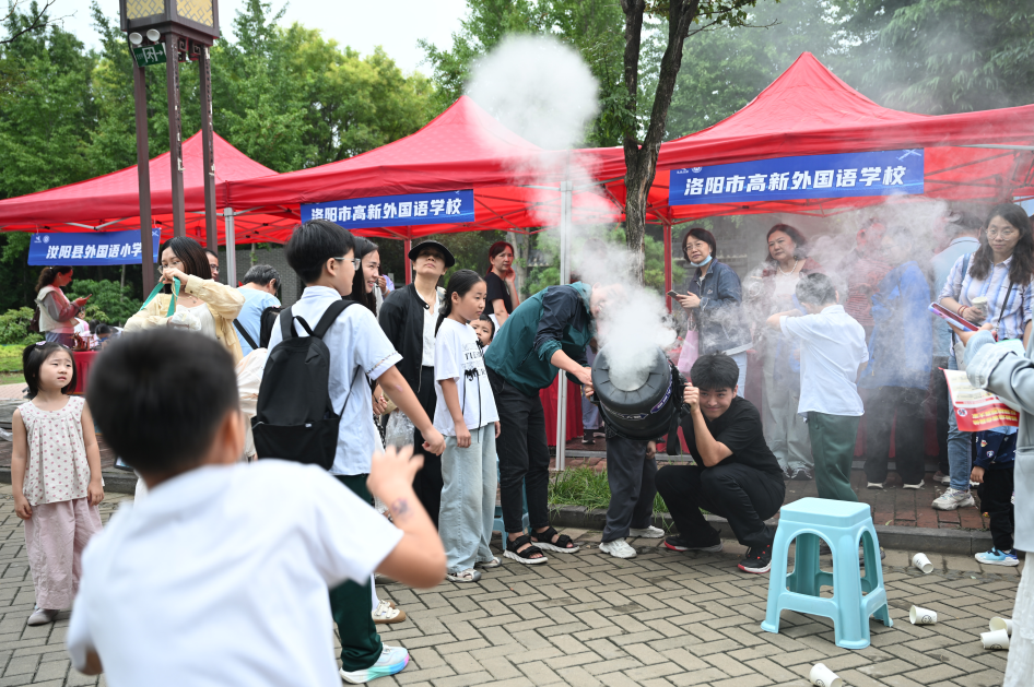 在科普互动展区,洛阳市科学技术馆等参展单位开在公园草坪上的科学实验趣味课、无人机飞行操演等,引来不少家长和学生观看喝彩。