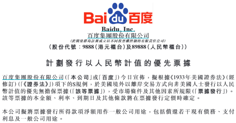 【大河财立方消息】9月8日,百度集团发布公告称,拟根据有关规例,于美国境外以离岸交易方式向非美国人士发行以人民币计值的优先无担保票据,票据的本金额、利率、到期日及其他条款将在票据发行定价时确定。