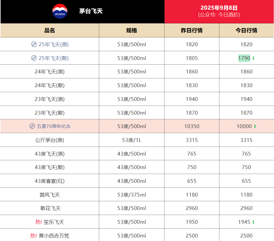 【大河财立方消息】9月8日,今日酒价披露的批发参考价显示,2025年飞天茅台原箱价格较前一日无变化,报1820元/瓶;2025年飞天茅台散瓶较前一日下跌15元,报1790元/瓶。
