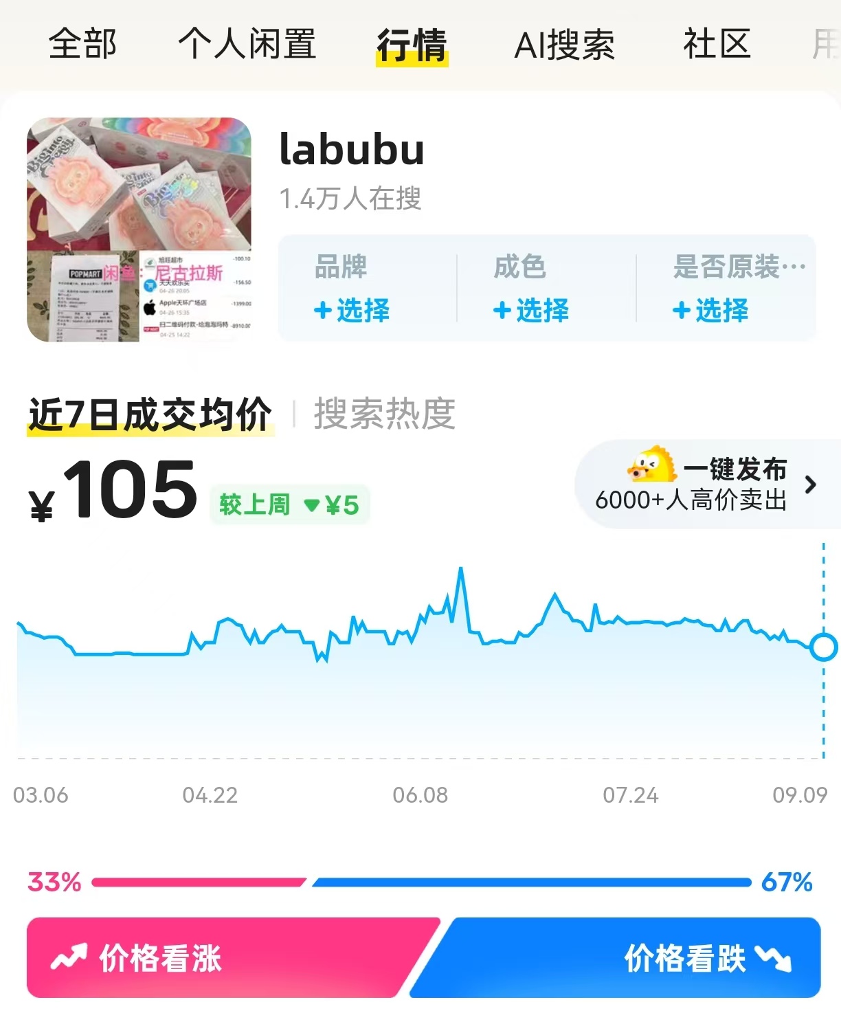 消息面上,第一至第三代LABUBU的二手价格普遍呈现下跌态势,单日跌幅在3元至11元之间。近期多个系列二手价格持续走低,部分款式跌幅超过10%。闲鱼平台数据显示,当前有1.4万用户搜索"LABUBU",其中67%的用户认为价格将继续下跌,仅33%认为可能回升。