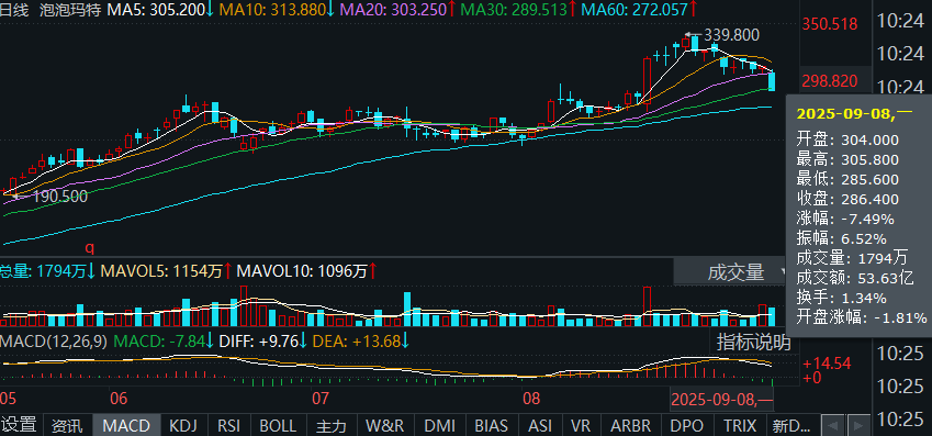 【大河财立方消息】9月8日,截至10点25分发稿,泡泡玛特(09992.HK)跌7.49%,成交额53.63亿港元。
