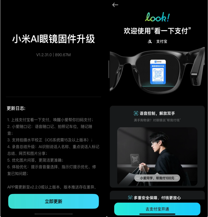 近日,小米AI眼镜发布1.2.31.0正式版固件更新,此次更新的功能包括支持用户语音唤醒小爱协助扫码支付。收到升级通知的用户,可根据页面提示,佩戴眼镜绑定支付宝“看一下支付”。