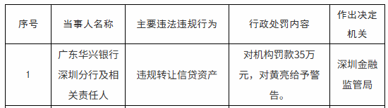 因违规转让信贷资产,广东华兴银行深圳分行被罚款35万元,相关责任人黄亮被警告。