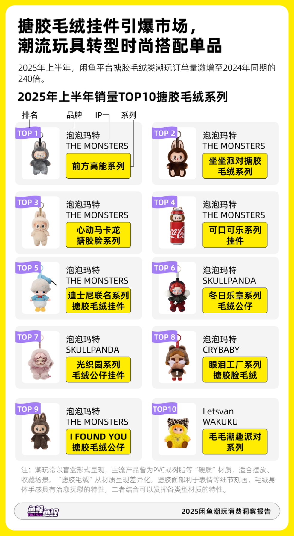 潮玩常以盲盒形式呈现,主流产品曾为PVC或树脂等“硬质”材质,适合摆放、收藏场景。近两年开始流行“搪胶毛绒”材质的潮玩,兼具把玩与时尚搭配属性,可作为包挂或穿搭单品,推动潮玩从“玩具”走向“饰品”领域,加速了其破圈的过程。2025年上半年,闲鱼平台搪胶毛绒类潮玩订单量激增至2024年同期的240倍,其中THE MONSTERS、DIMOO、SKULLPANDA、CRYBABY、WAKUKU等IP最受追捧。
