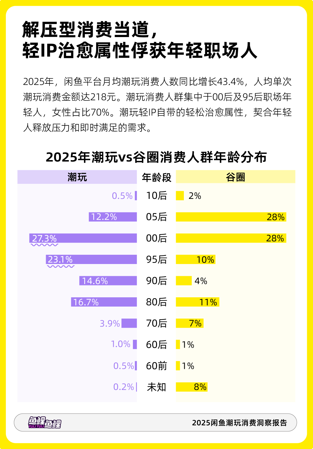 报告调研了潮玩消费者群体,发现2025年闲鱼平台月均潮玩消费人数同比增长43.4%,人均单次潮玩消费金额达218元。相较于受众年龄更低的谷圈,潮玩消费人群主要为95后及00后职场年轻人,女性占比70%。潮玩类轻IP自带的轻松治愈属性,正契合当下年轻人释放压力和即时满足的需求。
