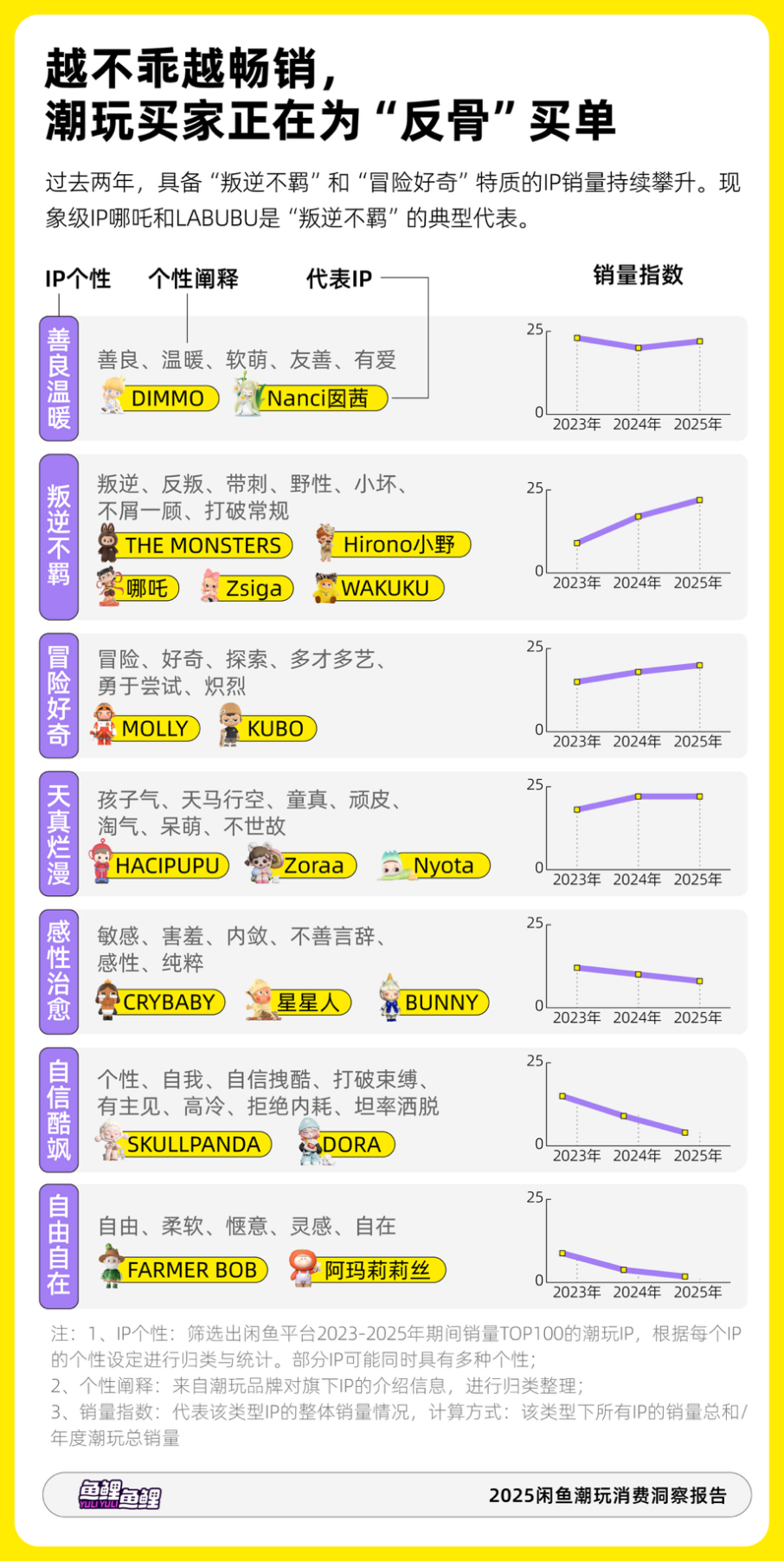 越“不乖”越畅销,潮玩成为年轻人的精神代餐。报告研究了过去三年闲鱼平台销量TOP100的潮玩IP,发现THE MONSTERS(LABUBU)、Hirono小野、哪吒、Zsiga等具备“叛逆不羁”“冒险好奇”特质的IP销量持续攀升。潮玩作为典型的情绪消费,不同时期的畅销IP反映出消费者的情感投射,相比过去,当下潮玩爱好者更愿意为“反骨”买单。