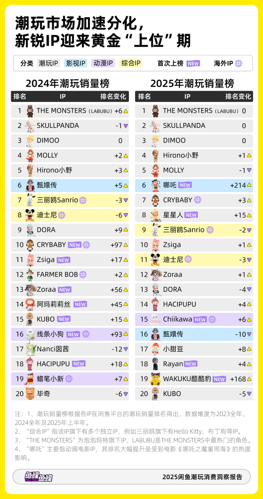 《2025闲鱼潮玩消费洞察报告》显示,国内潮玩市场加速分化,本土新IP迎来黄金上升期。近两年,国内设计师创作的新生代潮玩IP销量排名大幅跃升,例如2025年星星人上升15位,WAKUKU酷酷豹上升168位,2024年Zorra上升56位。这表明潮玩市场对本土设计的接受度高,新IP能快速捕获消费者兴趣。内容型IP例如《甄嬛传》和《哪吒》则受作品热度影响,商品销量波动大。