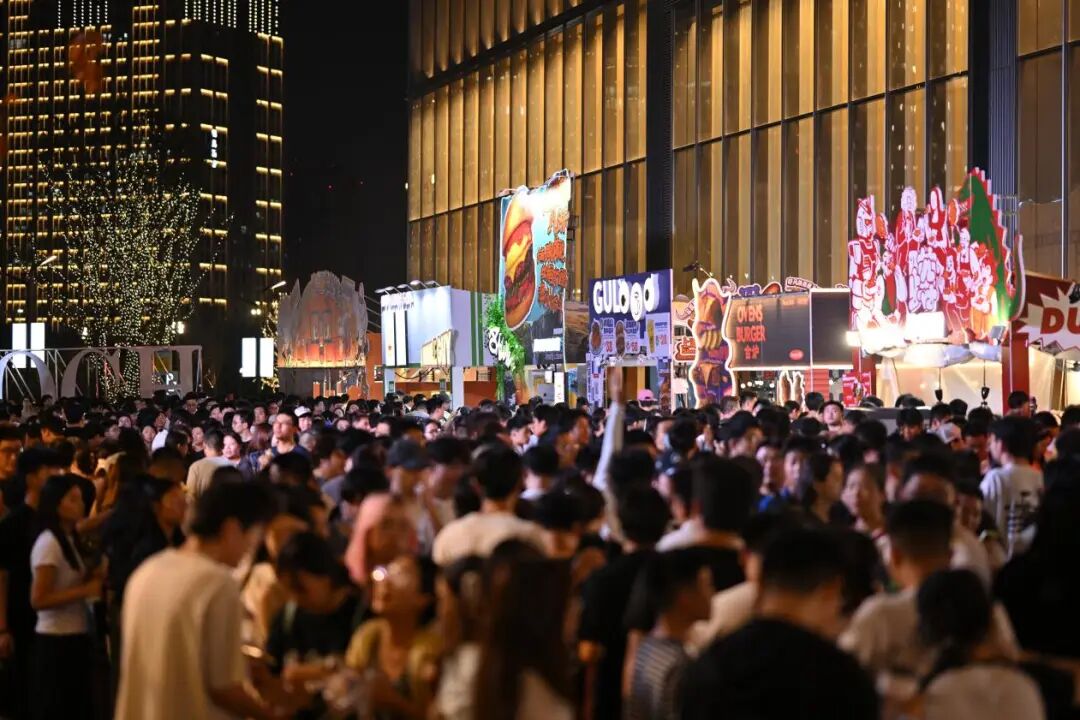 9月4日,周四,大雨滂沱,郑东万象城外广场仍排起长队。8月29日,“2025 HOCH汉堡节全国巡展”在郑东万象城开场。这是该主题活动首次被引入河南,现场汇聚了国内20多个城市、30余家中高端人气汉堡品牌。