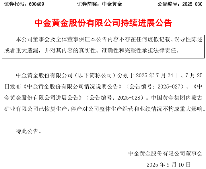 【大河财立方消息】9月9日,中金黄金股份有限公司(证券简称中金黄金)发布公告称,中国黄金集团内蒙古矿业有限公司已恢复生产,停产对公司整体生产经营和业绩情况不构成重大影响。