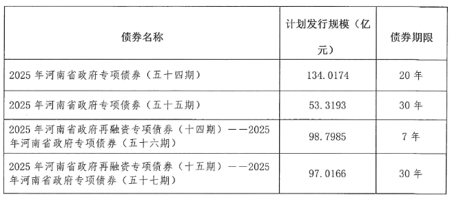 【大河财立方消息】9月9日,河南省财政厅发布通知,经河南省人民政府同意,决定发行2025年河南省政府专项债券(五十四至五十六期)和再融资专项债券(十五期),拟发行总额为383.1518亿元,品种为记账式固定利率附息债券,9月16日招标,9月17日开始计息。