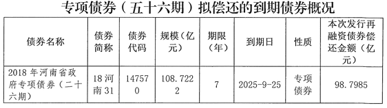 发行的专项债券(五十六期),用于偿还2018年河南省政府专项债券(二十六期)的部分本金。