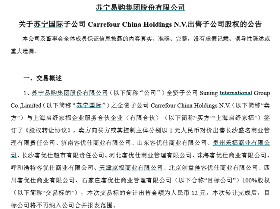 9月9日晚间,苏宁易购发布公告称,全资子公司苏宁国际之全资子公司Carrefour China Holdings N.V.(以下简称卖方)与上海启纾家福企业服务合伙企业(有限合伙)(以下简称上海启纾家福)签订了《股权转让协议》,卖方向上海启纾家福或其控制主体分别以1元人民币对价出售长沙盛名商业管理有限责任公司、长沙客优仕超市有限责任公司等12家公司100%股权,合计出售金额为人民币12元。本次转让完成后,上述12家公司将不再纳入公司合并报表范围。本次交易不构成关联交易,亦不构成重大资产重组。