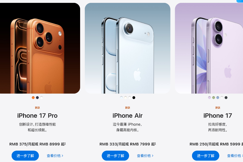 苹果中国官网显示,iPhone 17(256GB)的起售价为5999元人民币,iPhone Air为7999元人民币;iPhone Pro为8999元人民币,Pro Max为9999元人民币。顶配iPhone Pro Max(2TB)的售价为17999元人民币。