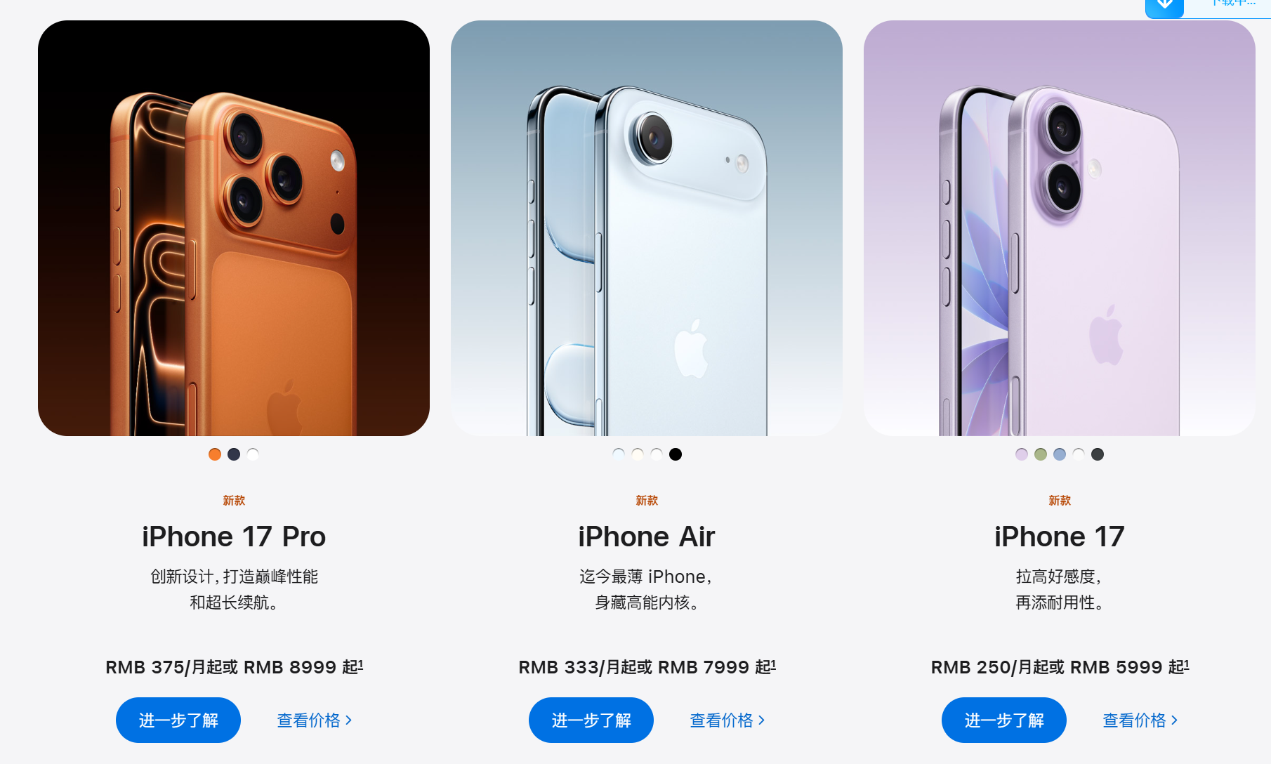 苹果中国官网显示,iPhone 17(256GB)的起售价为5999元人民币,iPhone Air为7999元人民币;iPhone Pro为8999元人民币,Pro Max为9999元人民币。顶配iPhone Pro Max(2TB)的售价为17999元人民币。
