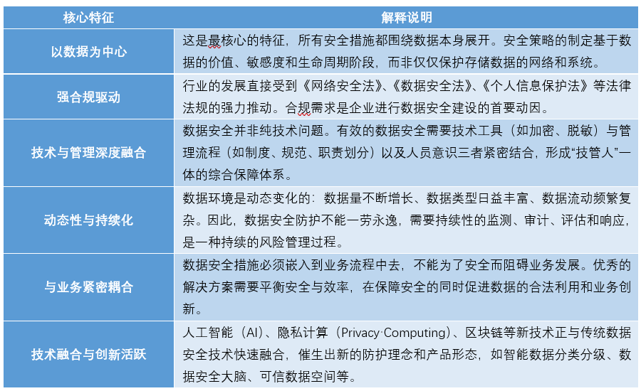 数据安全行业是指为保障数据在全生命周期(采集、传输、存储、处理、交换、使用、共享、归档、销毁)过程中的机密性、完整性和可用性,以及在此基础上延伸出的可控性和不可否认性,而提供技术、产品、服务和解决方案的所有经济活动集合。数据安全行业的核心目标是保护数据本身,确保数据在安全的前提下,能够合法、合规、有序地流通和利用,释放其作为生产要素的价值。