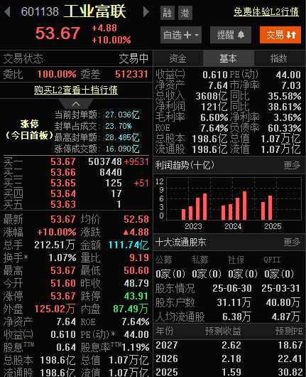 【大河财立方消息】9月10日开盘,工业富联股价高开高走。截至发稿,工业富联涨停,股价53.67元/股,市值1.07万亿元,封单资金超27亿元。