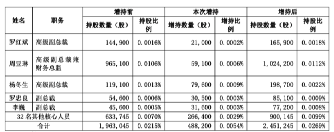 公司其他32名核心人员亦于近日通过深圳证券交易所交易系统以集中竞价交易方式增持公司A股股份共计26.64万股,增持金额共计2870.36万元。增持资金均为自有或自筹资金。