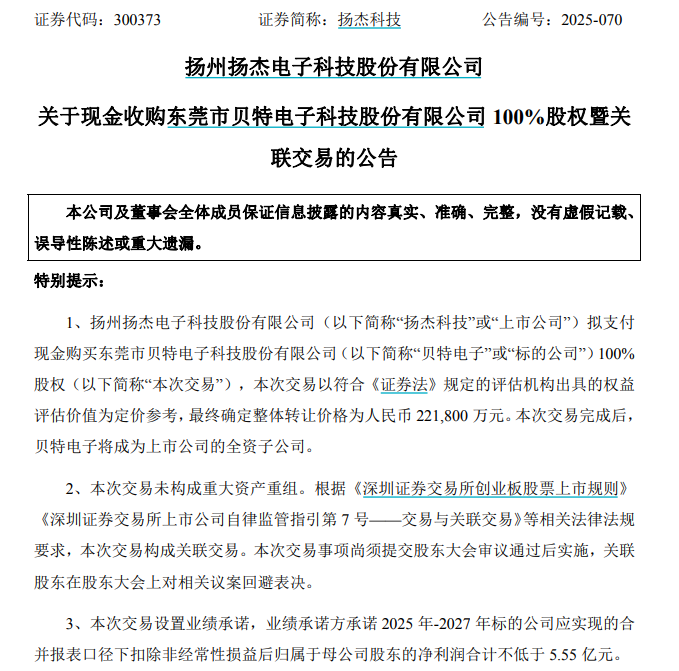 【大河财立方消息】9月11日晚间,扬州扬杰电子科技股份有限公司(证券简称:扬杰科技)公告,拟支付现金购买东莞市贝特电子科技股份有限公司100%股权;贝特电子整体转让价格为22.18亿元。