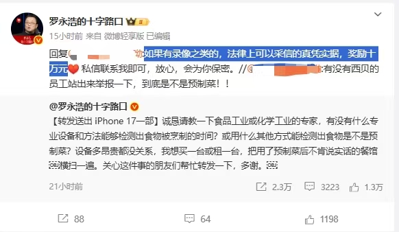当晚,罗永浩连发数条微博予以反击,并公开征集“西贝预制菜”证据,称“如果有录像之类的、法律上可以采信的真凭实据,奖励十万元”“如果有了解西贝是否使用预制菜内幕的朋友,请跟我私信联系。”