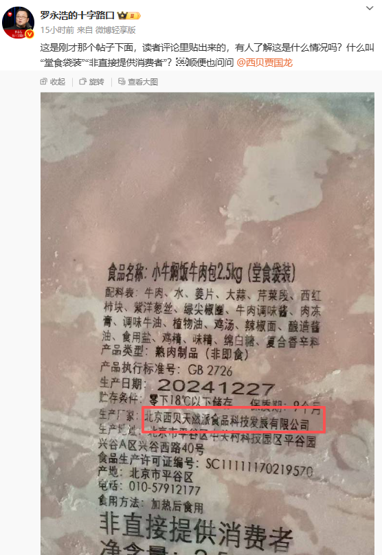 9月12日,罗永浩在微博上发布有关媒体报道截图,截图显示,“西贝等连锁餐饮企业预制菜占比达80%以上”。而在此之前,罗永浩曾发布一张网友在其评论区下方的图片,图片为一袋“小牛焖饭牛肉包2.5kg”,生产厂家为“北京西贝天然派食品科技发展有限公司”。