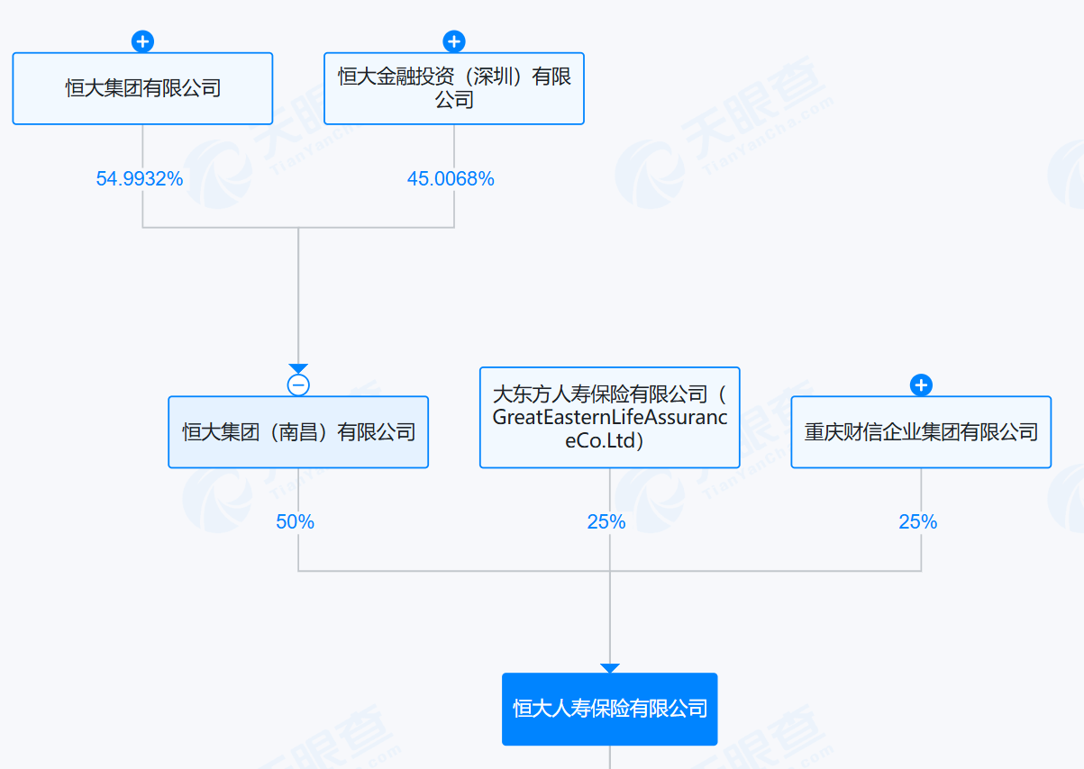 天眼查显示,恒大人寿保险有限公司成立于2006年,由恒大集团旗下恒大集团(南昌)有限公司持股50%,大方人寿保险有限公司、重庆财信企业集团有限公司分别持股25%。