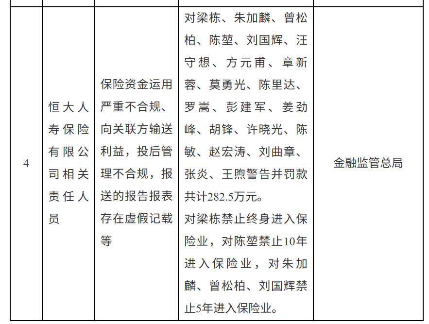【大河财立方消息】9月12日,国家金融监督管理总局披露的行政处罚信息公示列表显示,因保险资金运用严重不合规、向关联方输送利益,投后管理不合规,报送的报告报表存在虚假记载等,恒大人寿保险有限公司20名相关责任人员警告并罚款共计282.5万元。