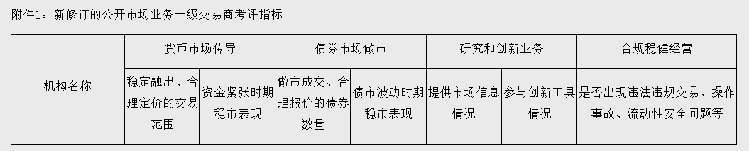 新修订的公开市场业务一级交易商考评指标,涉及货币市场传导、债券市场做市、研究和创新业务、合规稳健经营等方面。具体如下: