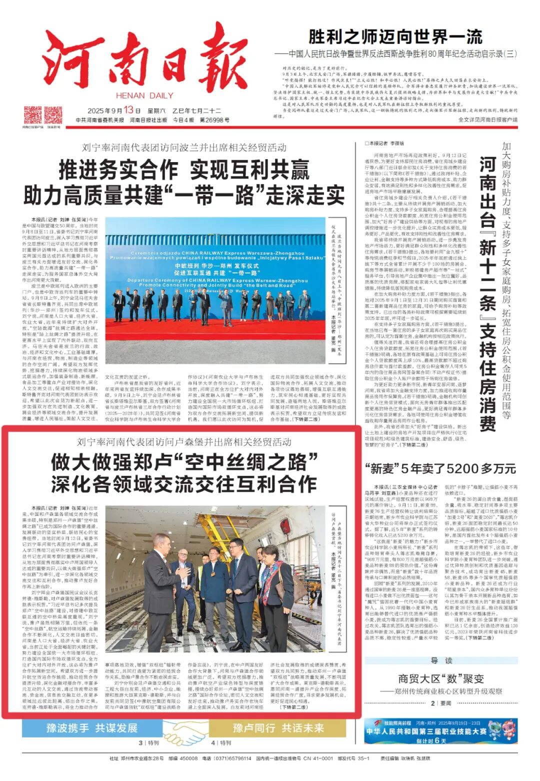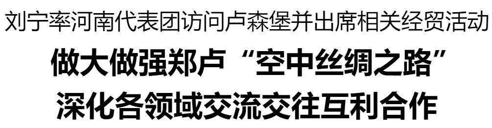 近年来,中国和卢森堡各领域交流合作成果丰硕,特别是郑州—卢森堡“空中丝绸之路”已成为国际合作的重要通道、发展联动的坚实桥梁、联结民心的宝贵纽带。当地时间9月12日,省委书记刘宁率河南代表团访问卢森堡,深入学习贯彻习近平外交思想和习近平总书记在河南考察时重要讲话精神,从地方层面贯彻落实中卢两国领导人达成的重要共识,以做大做强郑卢“空中丝路”为牵引,进一步深化各领域交流交往和互利合作,推动豫卢友好合作再上新台阶。
