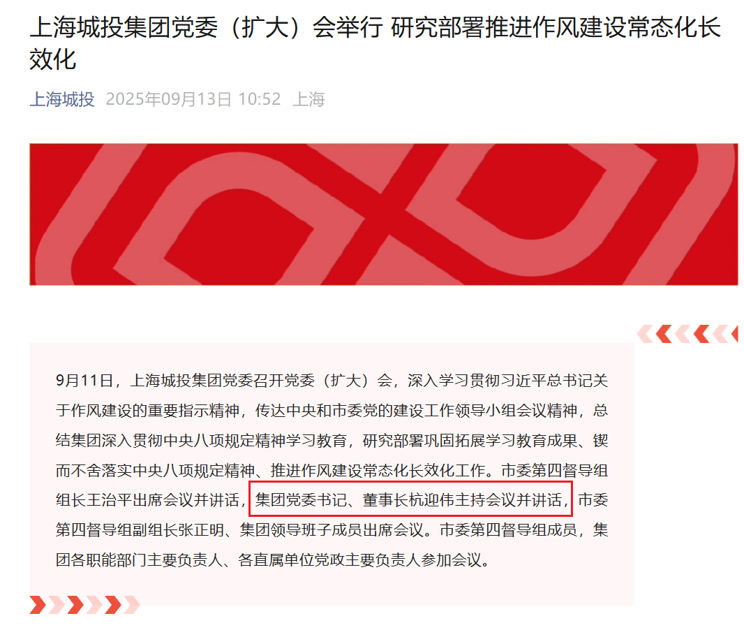【大河财立方消息】9月13日消息,据上海城投微信公众号,9月11日,上海城投集团党委召开党委(扩大)会,集团党委书记、董事长杭迎伟主持会议并讲话。