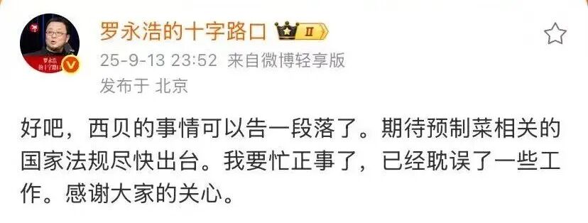 9月13日晚,罗永浩最新发声称,西贝的事情可以告一段落了。期待预制菜相关的国家法规尽快出台。我要忙正事了,已经耽误了一些工作。感谢大家的关心。