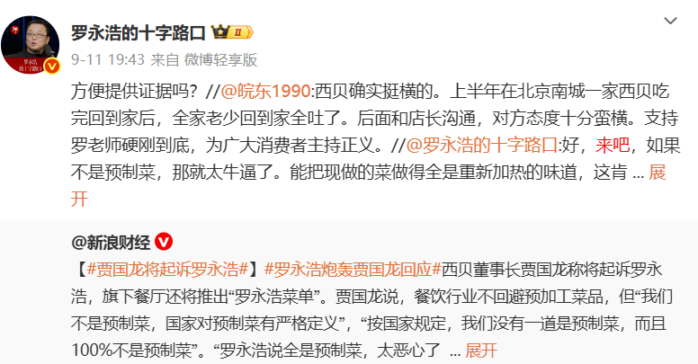 回顾事件始末,9月10日,罗永浩发博公开吐槽连锁餐饮品牌西贝:“好久没吃西贝了,今天下飞机跟同事吃了一顿,发现几乎全都是预制菜,还那么贵。希望国家尽早推动立法,强制饭馆注明是否用了预制菜。”