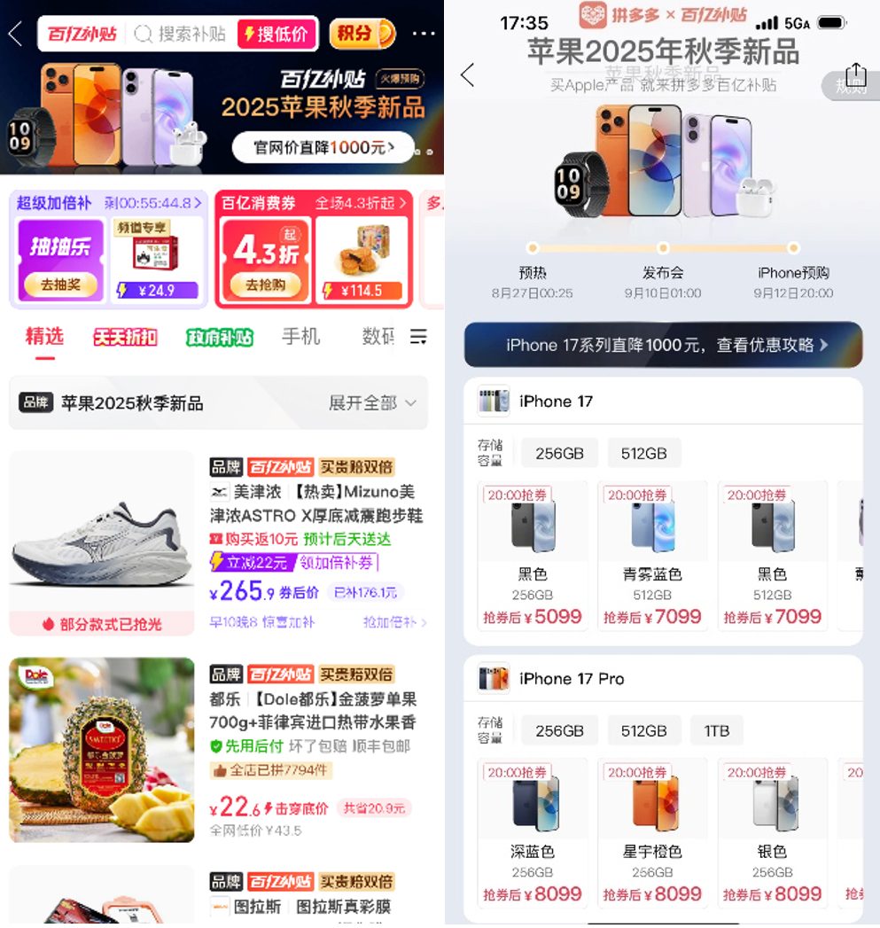 【大河财立方 记者 陈薇】9月12日晚8点,拼多多百亿补贴正式上线苹果2025年秋季全系新品,iPhone 17系列新品开售直降1000元。