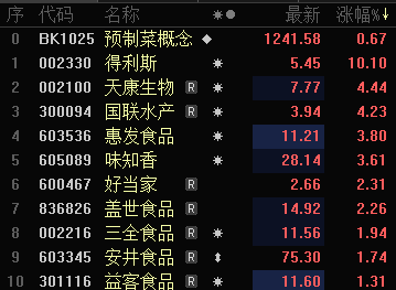 截至发稿,得利斯涨停,天康生物、国联水产、惠发食品、味知香等个股涨超3%。