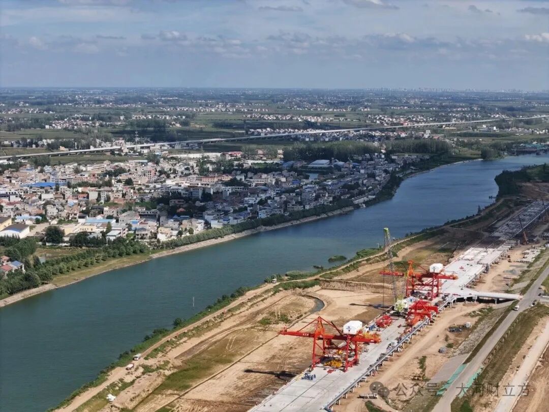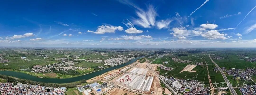 无人机的视野就更开阔了——空中,低垂的云团上方,数道或浓或淡的航迹云,证明这里是繁忙的空中航道。下方,郑合高铁列车飞驰,沙颍河上又有船只从不远处的范营作业区启航。