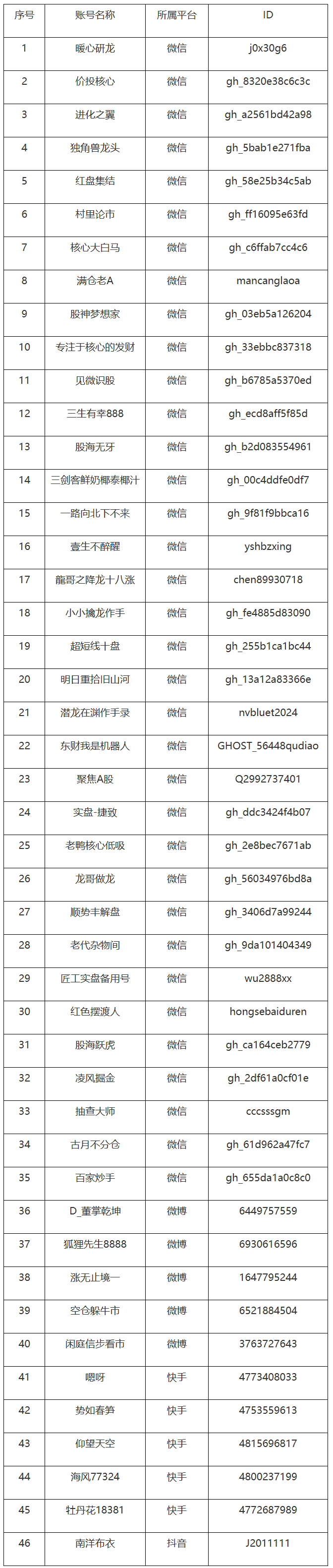 河南证监局在日常监管中发现,“暖心研龙”“价投核心”等46个IP属地在河南的网络平台账号涉嫌存在未经证监会核准,发布证券分析、预测或推荐股票等证券投资咨询服务信息的情形。