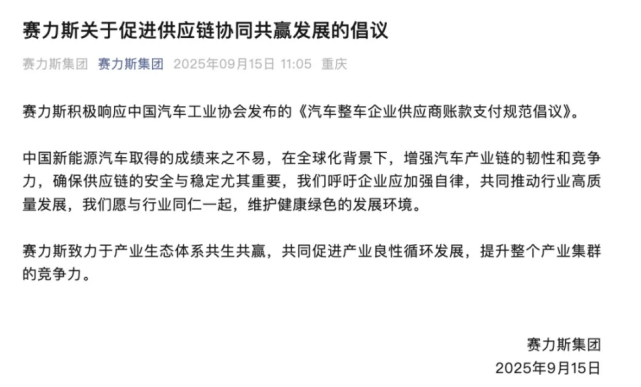 赛力斯表示,在全球化背景下,增强汽车产业链的韧性和竞争力,确保供应链的安全与稳定尤其重要,因此公司呼吁企业应加强自律,共同推动行业高质量发展,一起维护健康绿色的发展环境,共同促进产业良性循环发展,提升整个产业集群的竞争力。